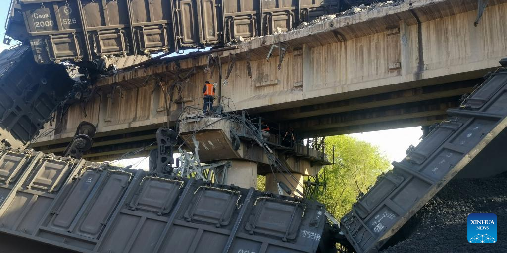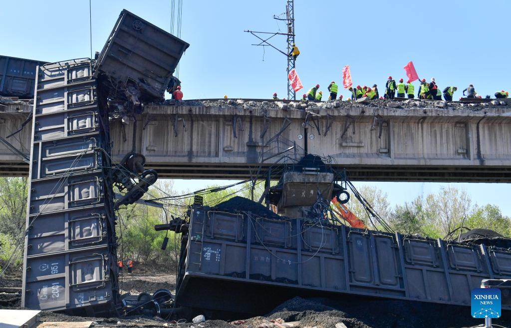 Photo taken on April 14, 2022 shows the site of a freight train accident in north China's Tianjin. An accident involving two freight trains carrying coal took place on Thursday in north China's Tianjin Municipality, causing some carriages to derail, according to local authorities. The accident occurred at approximately 1 p.m. on a section of the Datong-Qinhuangdao Railway, the municipal emergency management bureau said. Railway authorities have dispatched six rescue trains and nearly 1,000 rescue workers to the site. No casualties have been reported so far. (Xinhua)