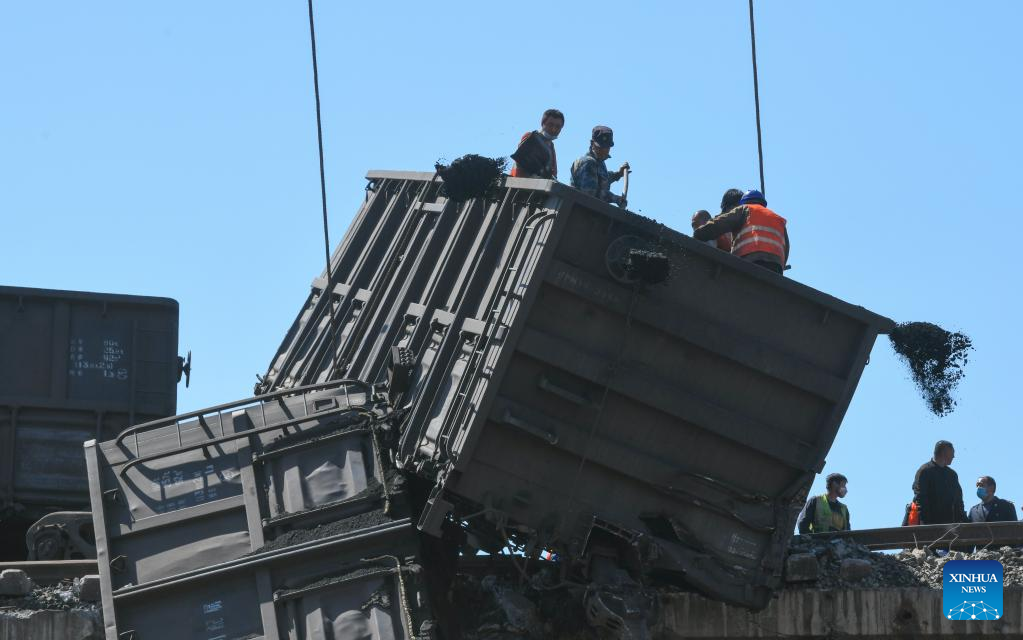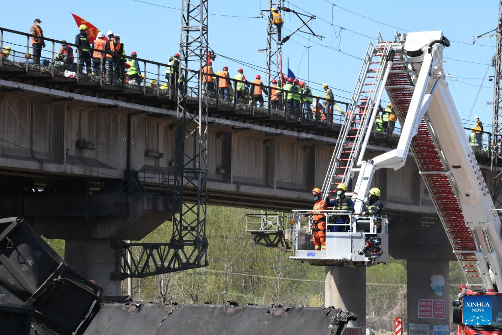 Rescuers work at the site of a freight train accident in north China's Tianjin, April 14, 2022. An accident involving two freight trains carrying coal took place on Thursday in north China's Tianjin Municipality, causing some carriages to derail, according to local authorities.