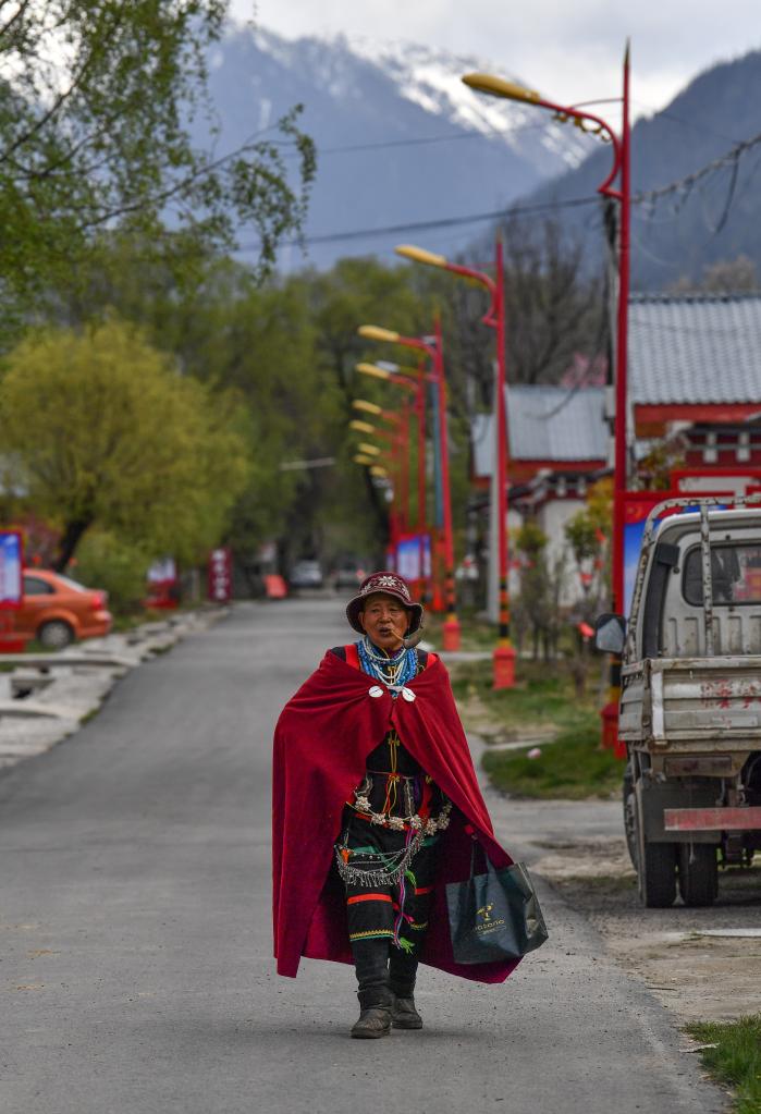 Yabao, 74, walks on a road in Namyi Lhoba Ethnic Township of Mainling County, southwest China's Tibet Autonomous Region, April 12, 2022. (Xinhua/Sun Fei)