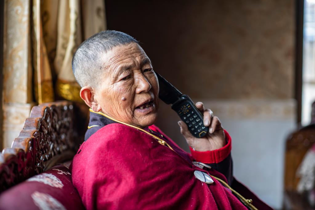 Yabao, 74, makes a phone call in Namyi Lhoba Ethnic Township of Mainling County, southwest China's Tibet Autonomous Region, April 12, 2022. (Xinhua/Sun Fei)