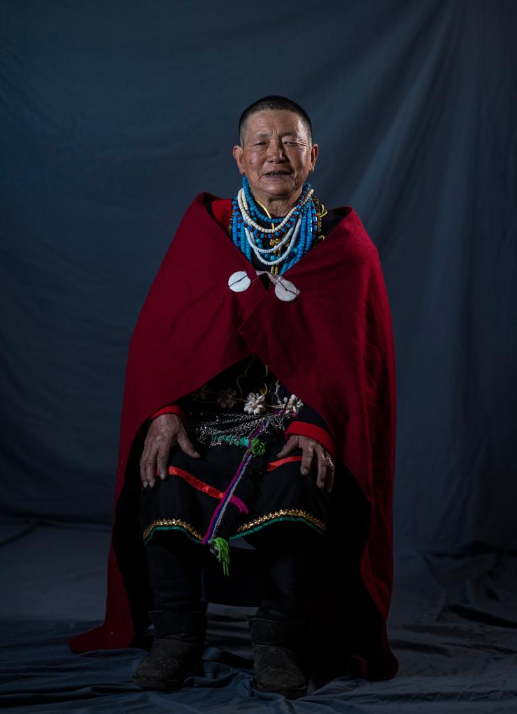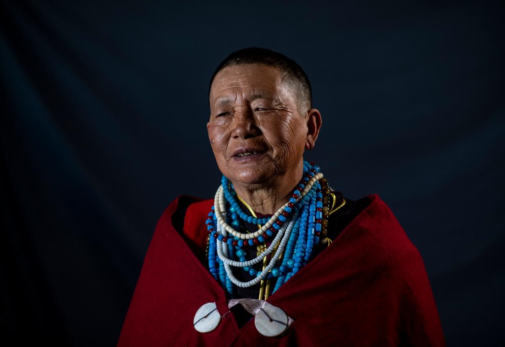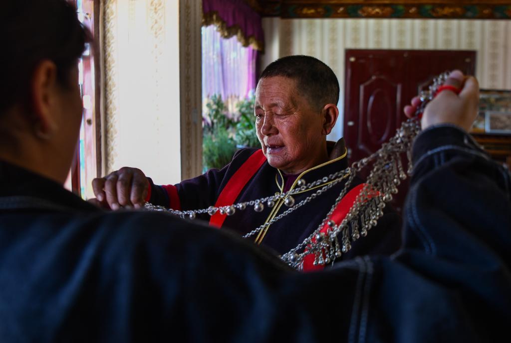 Yabao, 74, puts on traditional Lhoba clothing in Namyi Lhoba Ethnic Township of Mainling County, southwest China's Tibet Autonomous Region, April 12, 2022. (Xinhua/Jigme Dorje)