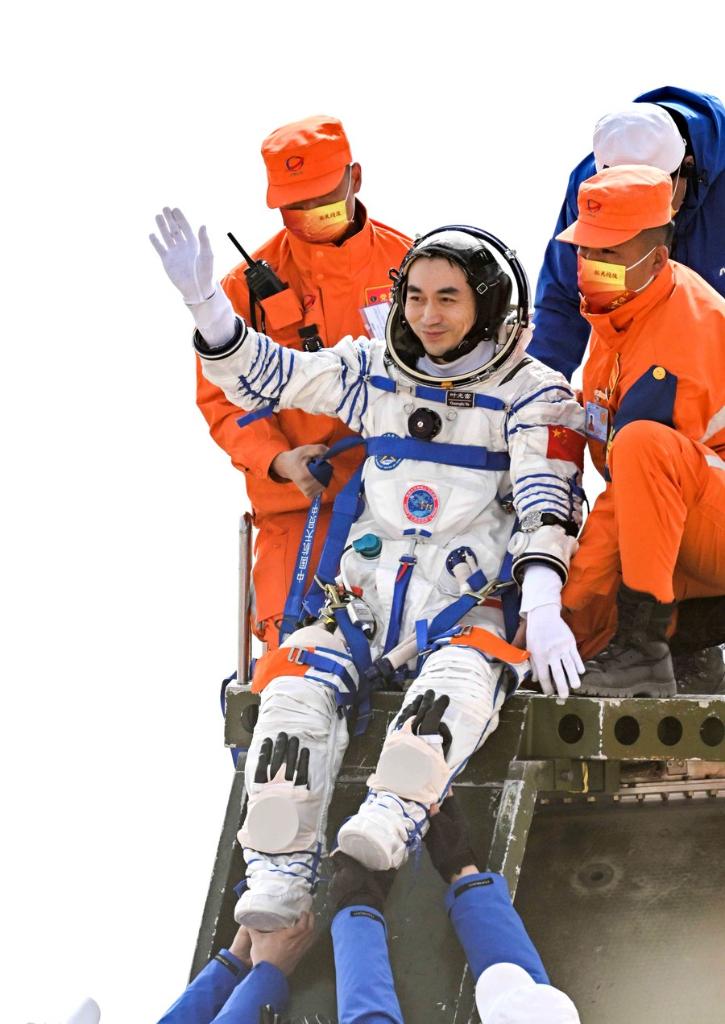 Astronaut Ye Guangfu is out of the return capsule of the Shenzhou-13 spaceship at the Dongfeng landing site in north China's Inner Mongolia Autonomous Region on April 16, 2022.(Xinhua/Lian Zhen)