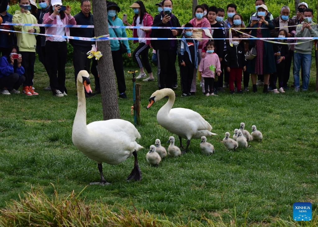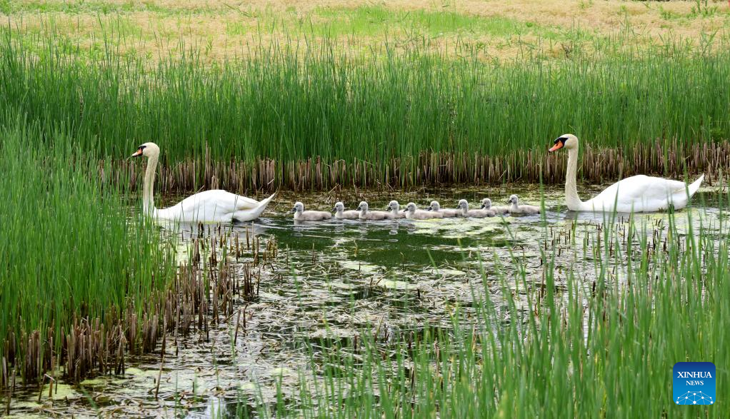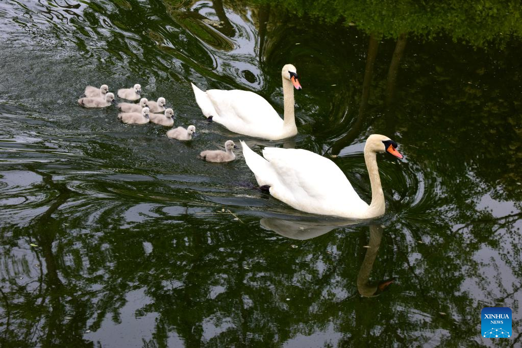 A pair of mute swans and their babies are seen at a wetland park in Zhengzhou, central China's Henan Province, April 16, 2022. Nine mute swan babies were born here recently. (Xinhua/Zhu Xiang)