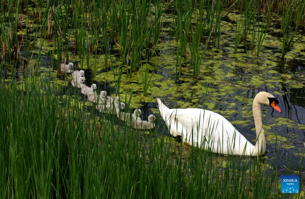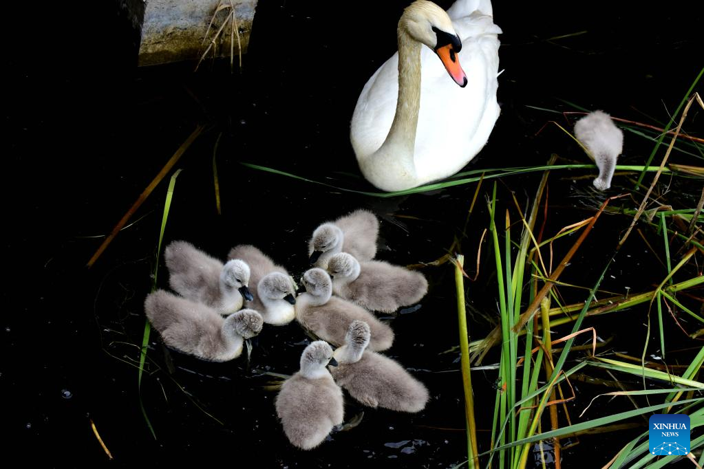 A mute swan and its babies are seen at a wetland park in Zhengzhou, central China's Henan Province, April 16, 2022. Nine mute swan babies were born here recently. (Xinhua/Zhu Xiang)