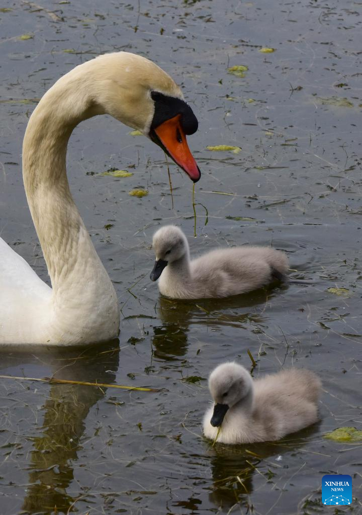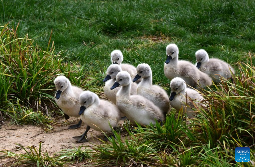 Mute swan babies are seen at a wetland park in Zhengzhou, central China's Henan Province, April 16, 2022. Nine mute swan babies were born here recently. (Xinhua/Zhu Xiang)