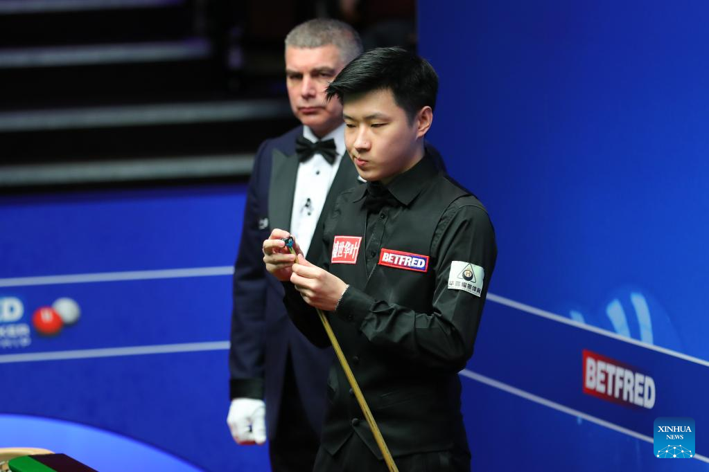 Zhao Xintong of China competes during the round one match against Jamie Clarke of Wales at the Betfred World Snooker Championships 2022 in Sheffield, Britain, April 16, 2022. (Photo by Zhai Zheng/Xinhua)