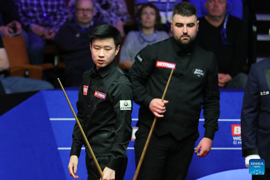 Zhao Xintong (L) of China and Jamie Clarke of Wales compete during the round one match at the Betfred World Snooker Championships 2022 in Sheffield, Britain, April 16, 2022. (Photo by Zhai Zheng/Xinhua)
