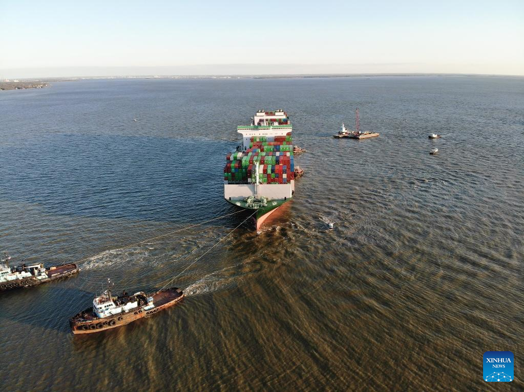 The ship -- which became stranded in the Chesapeake Bay on March 13 after departing the Port of Baltimore for Norfolk, Virginia -- was freed around 7 a.m. (1100 GMT) following a 35-day salvage operation. (U.S. Coast Guard/Devin Erfourth/Handout via Xinhua)