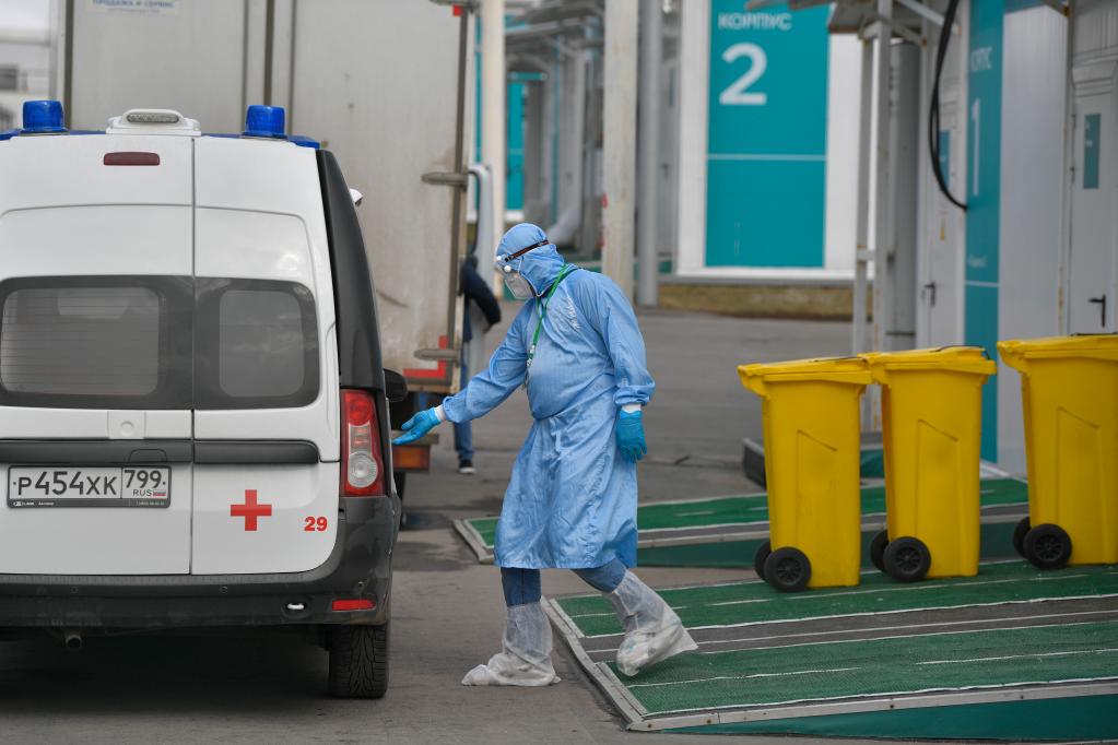 A medical worker wearing protective gear gets in an ambulance at a hospital in Kommunarka in the suburb of Moscow, Russia, April 15, 2022. (Photo by Alexander Zemlianichenko Jr/Xinhua)