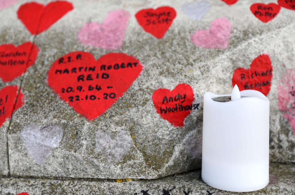 Hand painted hearts and messages commemorating victims of the COVID-19 pandemic are seen at the National COVID Memorial Wall in London, Britain, March 7, 2022. (Xinhua/Li Ying)