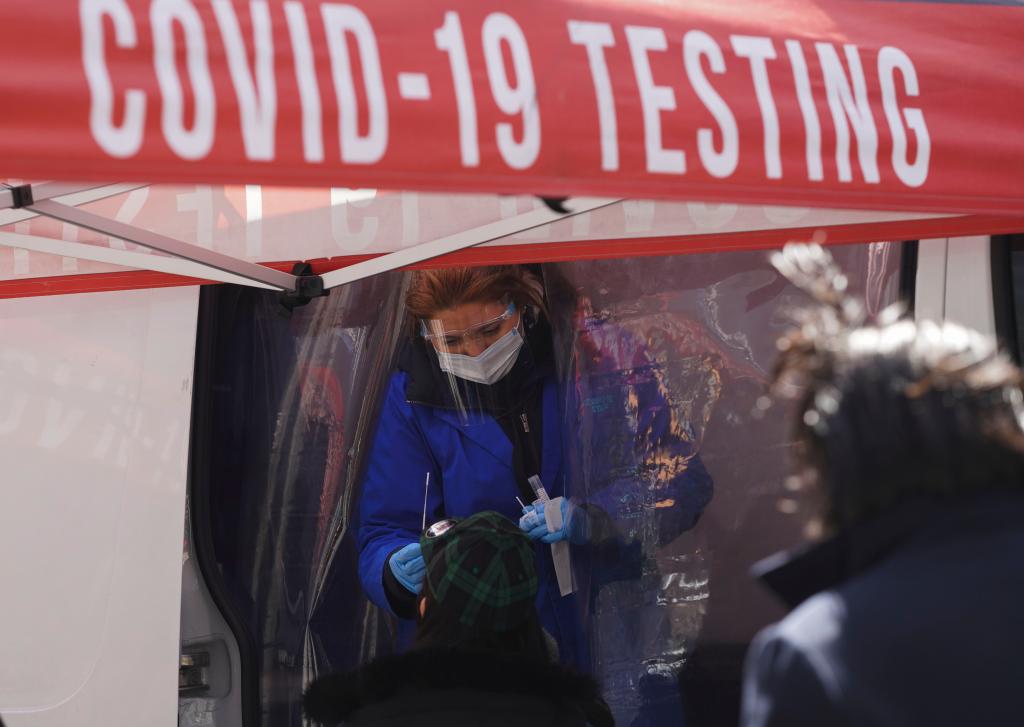 A medical worker collects a swab sample from a person at a COVID-19 testing site on Times Square in New York, the United States, March 29, 2022. (Xinhua/Wang Ying)