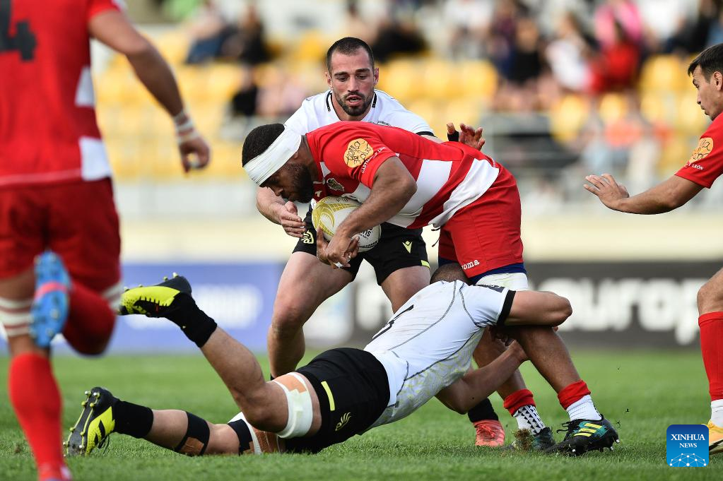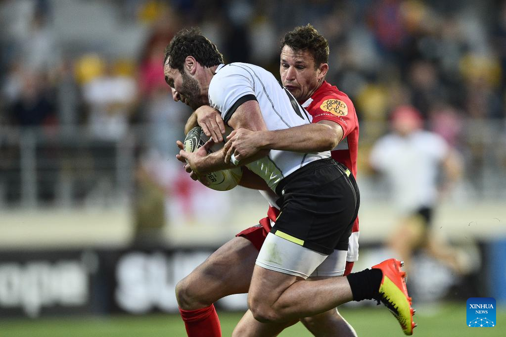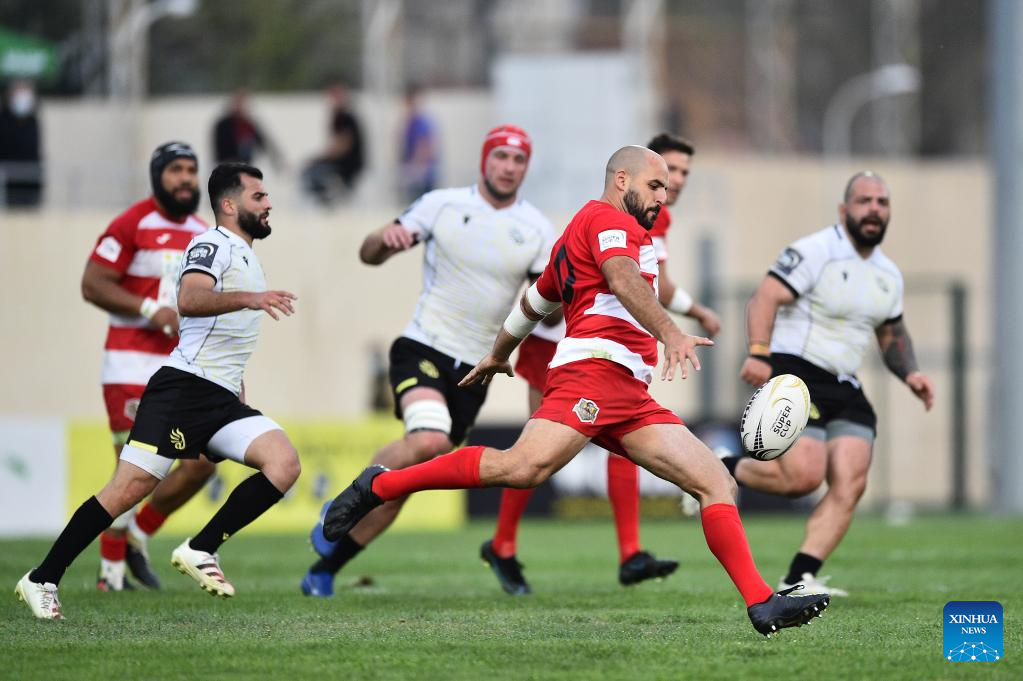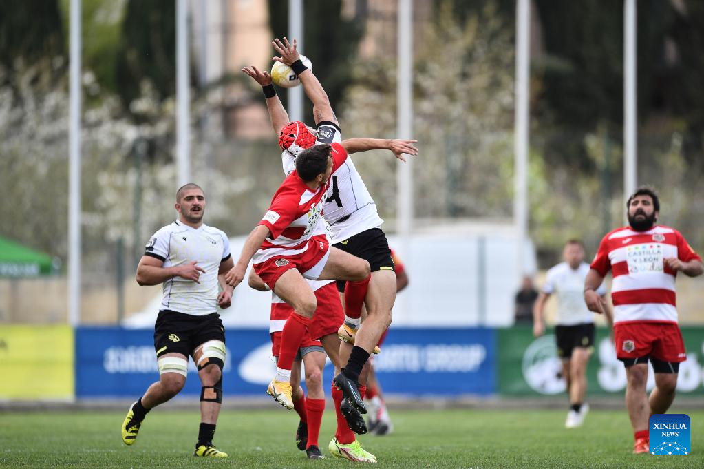 Samuel Katz (2nd R) of Castilla Y Leon Iberians competes during the match of Rugby Europe Super Cup between Georgia' Black Lion and Spain's Castilla Y Leon Iberians in Tbilisi, Georgia, April. 17, 2022. Georgia won the match with 43-40. (Photo by Tamuna Kulumbegashvili/Xinhua)