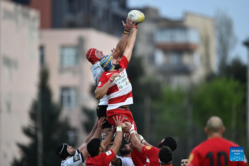 Nodar Cheishvili (Top L) of Black Lion competes with Sacha Casanas (Top R)of Castilla Y Leon Iberians during the match of Rugby Europe Super Cup between Georgia' Black Lion and Spain's Castilla Y Leon Iberians in Tbilisi, Georgia, April. 17, 2022. Georgia won the match with 43-40. (Photo by Tamuna Kulumbegashvili/Xinhua)