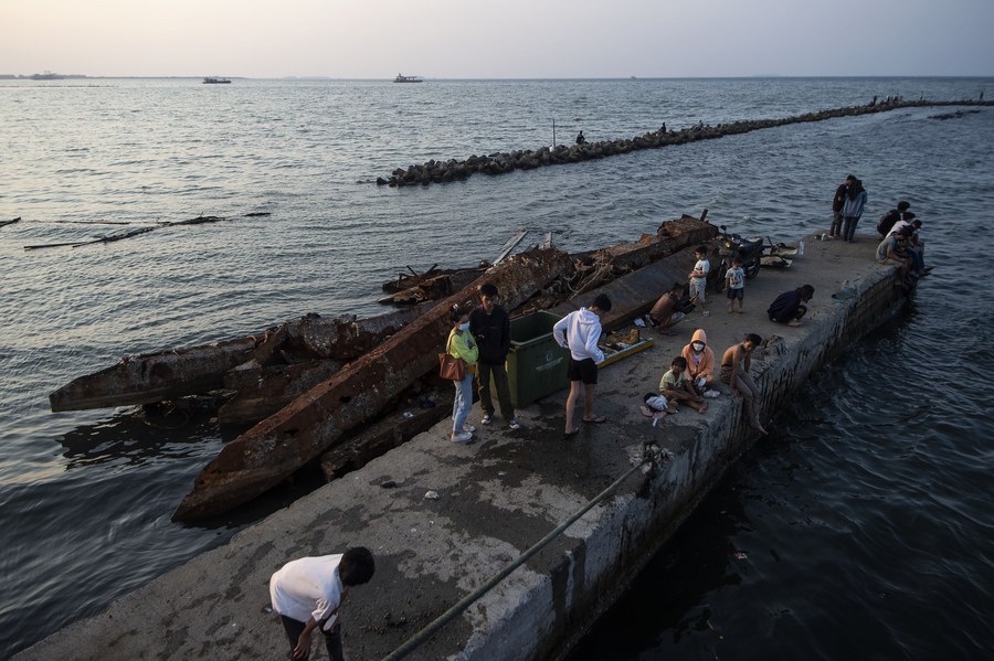 People walk on the pier in time spent before breaking the fast during the Islamic holy month of Ramadan at the fishing port of Muara Angke in north Jakarta, Indonesia on April 17, 2022.(Xinhua/Veri Sanovri)