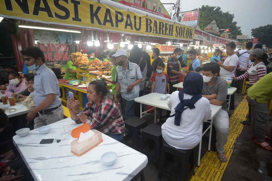 People wait for iftar at a market during the Islamic holy month of Ramadan in Jakarta, Indonesia, April 12, 2022. (Xinhua/Zulkarnain)