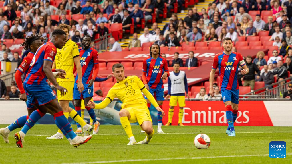 Chelsea's Mason Mount (C) scores the second goal during the FA Cup Semifinal match between Chelsea and Crystal Palace in London, Britain, on April 17, 2022. Chelsea won 2-0 and advanced into the final. (Xinhua)