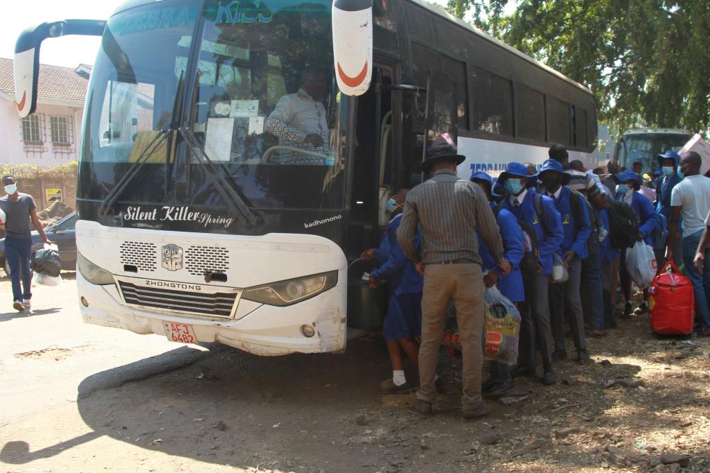 Students wait for a school bus on school opening day in Harare, Zimbabwe, on Sept. 5, 2021. (Xinhua/Tafara Mugwara)
