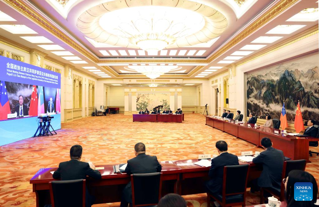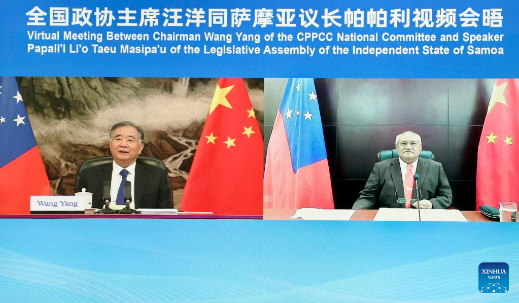 BEIJING, April 19 (Xinhua) -- China's top political advisor Wang Yang met with Papali'i Li'o Taeu Masipa'u, speaker of the Legislative Assembly of the Independent State of Samoa, on Tuesday via video link.