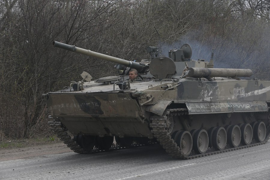 A tank proceeds along a road near Mariupol on April 17, 2022. (Photo by Victor/Xinhua)