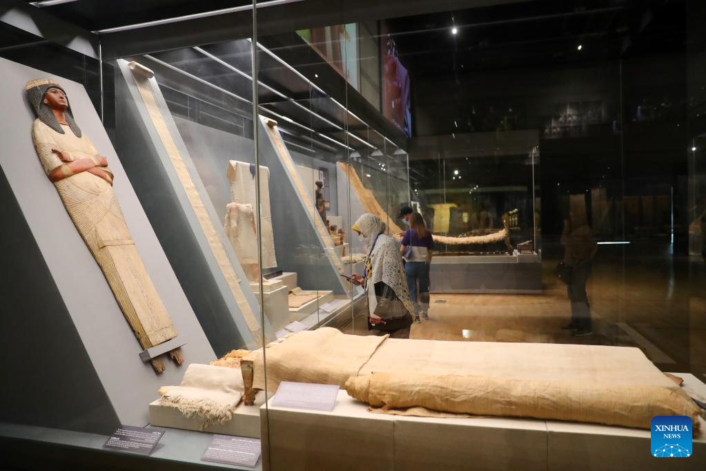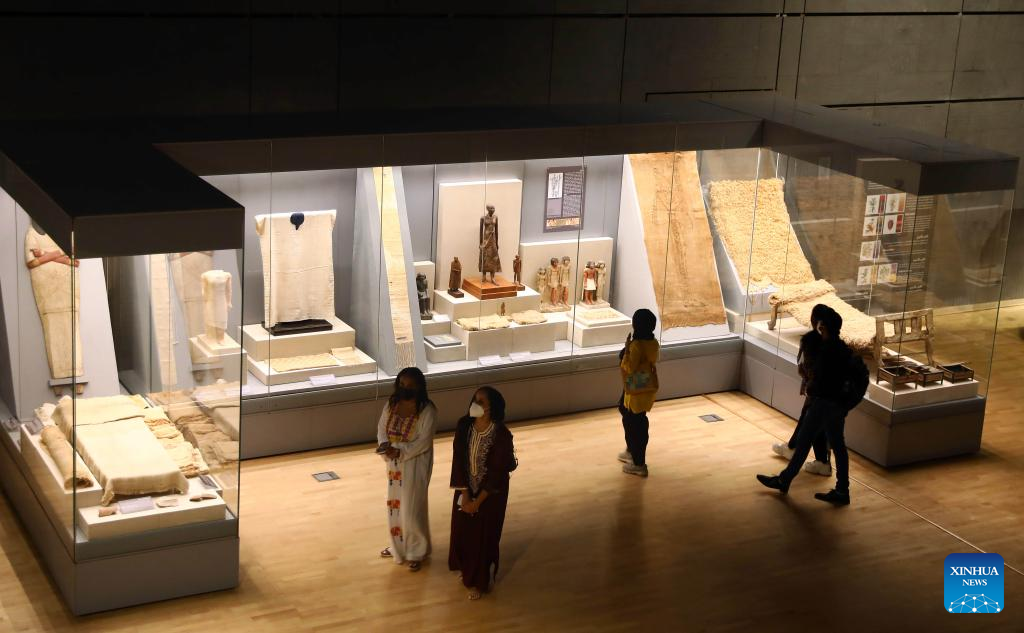 People visit the newly-opened textile hall at the National Museum of Egyptian Civilization (NMEC) in Cairo, Egypt, on April 19, 2022. The new 1,000-square-meter hall houses around 650 pieces, most of which are fabrics and garments, from the Pharaonic, Roman, Coptic, and Islamic eras. (Xinhua/Sui Xiankai)
