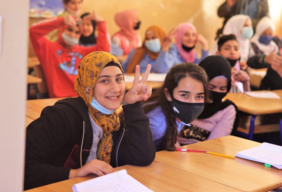 Syrian refugee students gesture during break time in the Kamal Jumblatt Official School in Mukhtara, Lebanon, on April 14, 2022. (Xinhua/Liu Zongya)