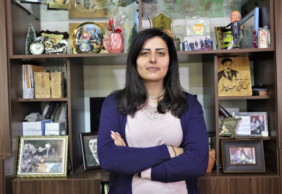 School General Director Manal Hodayfei stands in her office in the Kamal Jumblatt Official School in Mukhtara, Lebanon, on April 14, 2022. (Xinhua/Liu Zongya)