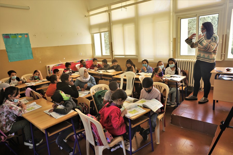 Syrian refugee students attending a class in the Kamal Jumblatt Official School in Mukhtara, Lebanon, on April 14, 2022. (Xinhua/Liu Zongya)