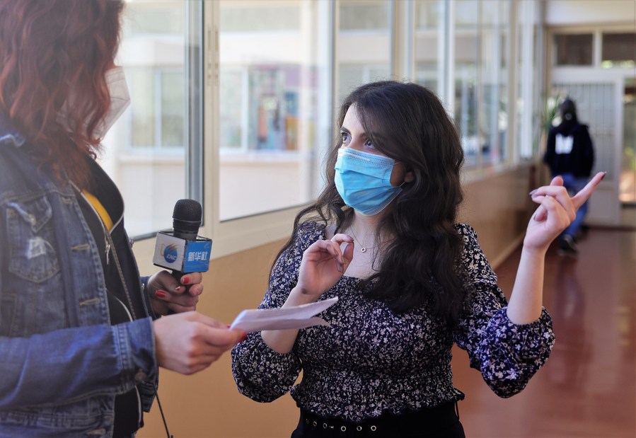 Remie Bachnak, a Lebanese mathematics teacher, is interviewed in the Kamal Jumblatt Official School in Mukhtara, Lebanon, on April 14, 2022. (Xinhua/Liu Zongya)