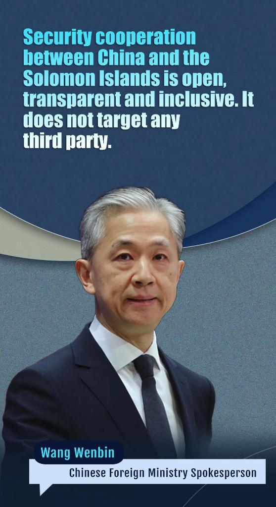 BEIJING, April 19 (Xinhua) -- Security cooperation between China and the Solomon Islands is open, transparent and inclusive. It does not target any third party, a Chinese Foreign Ministry spokesperson said on Tuesday.