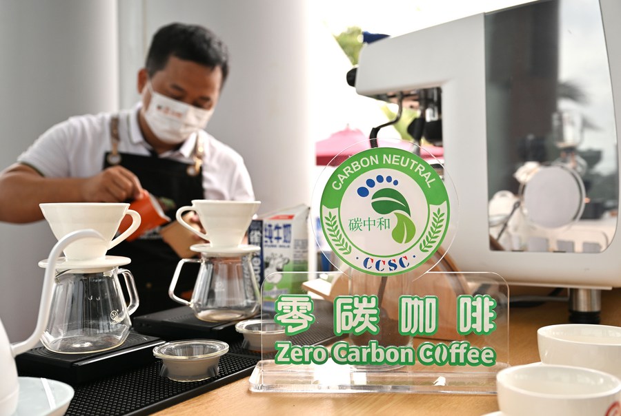 A staff member makes "zero-carbon" coffee at the media center for the Boao Forum for Asia (BFA) annual conference in Boao, south China's Hainan Province, April 20, 2022. (Xinhua/Guo Cheng)