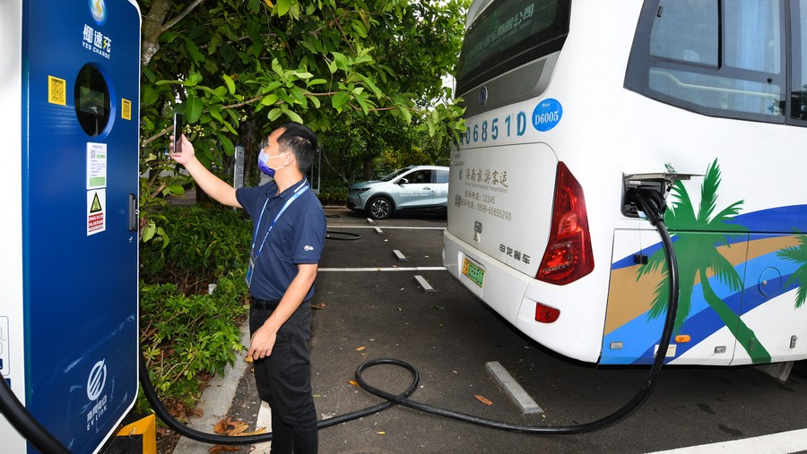 A staff member recharges a new-energy bus near the Boao Forum for Asia (BFA) International Conference Center in Boao, south China's Hainan Province, April 18, 2022. (Xinhua/Yang Guanyu)