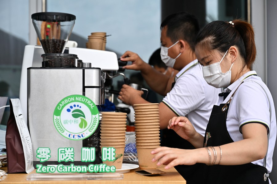 Staff members make "zero-carbon" coffee at the media center for the Boao Forum for Asia (BFA) annual conference in Boao, south China's Hainan Province, April 20, 2022. (Xinhua/Guo Cheng)