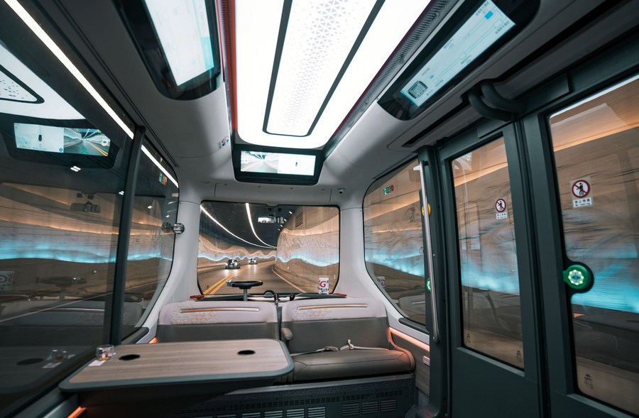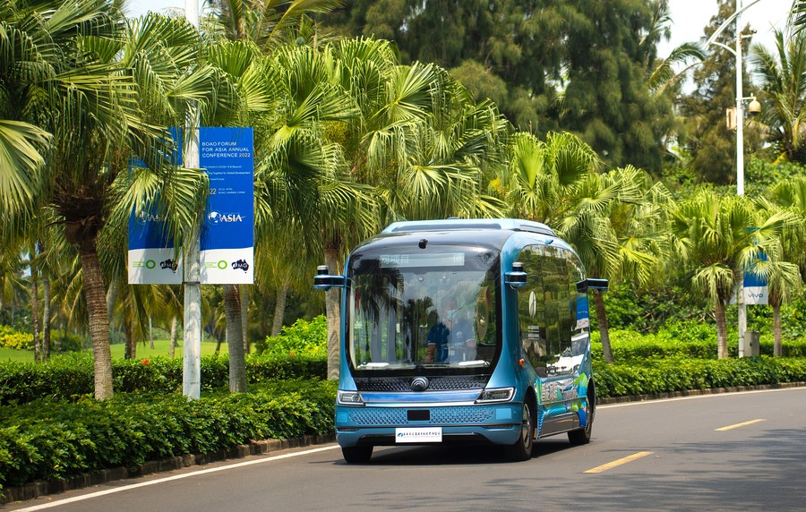 An auto-pilot new-energy commuter bus is in operation near the Boao Forum for Asia (BFA) International Conference Center in Boao, south China's Hainan Province, April 16, 2022. (Xinhua)