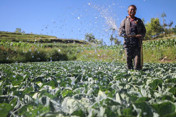 A villager waters a vegetable field in Anding District of Dingxi, northwest China's Gansu Province, July 13, 2021. (Xinhua/Ma Xiping)