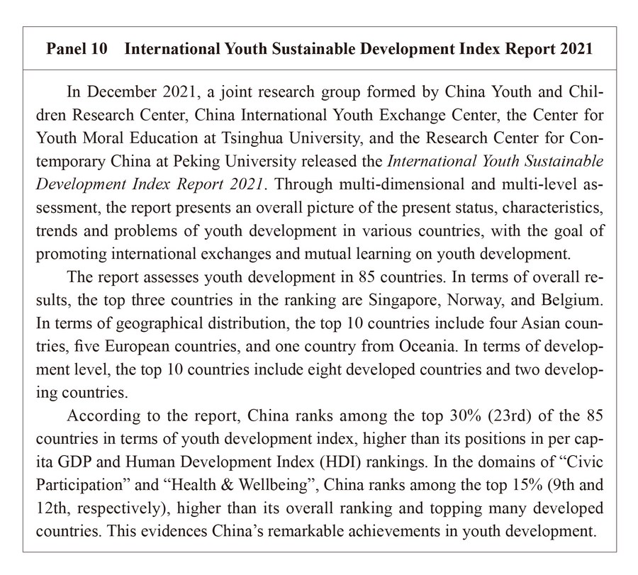 The "circle of friends" with whom China can communicate and cooperate continues to grow. China's youth seize every opportunity to tell China's stories and participate in global governance of youth affairs in various international arenas, and promote win-win cooperation through active exchanges and interactions under bilateral and multilateral frameworks. As young Chinese people take a more active part in bilateral exchange mechanisms, they become closer to their peers in other countries and build deeper bilateral ties. Under the framework of the Chinese Youth Global Partnership, China has established exchange and cooperation relationships with more than 100 international organizations, government youth agencies, political parties, and non-governmental youth organizations. Chinese youth are engaged in frequent international exchanges in fields like education, science, culture, arts, sports, and the media under the cultural and people-to-people exchange mechanisms between China and other countries and regions such as Russia, the United States, Europe, India and Japan. China's youth and their partners in neighboring countries and developing countries carry out cultural and people-to-people exchanges that bring fruitful results; they also achieve mutual benefit through incubating startups, promoting economic and trade cooperation, advancing technological exchange, and other efforts. China's young people have become more active in joining international organizations, attending international conferences, and participating in global governance. As a result, they have succeeded in enhancing the international image of China's youth.