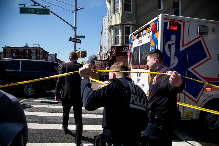 Police work at a nearby street after a shooting took place at a subway station in Brooklyn, New York, the United States, on April 12, 2022. (Photo by Michael Nagle/Xinhua)
