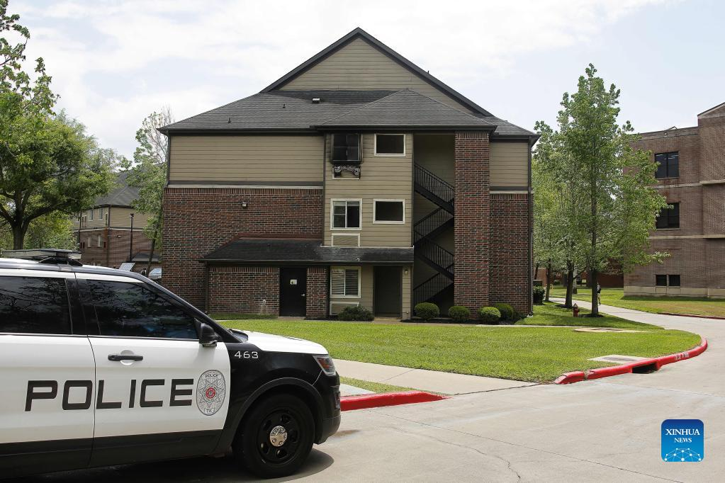 A police vehicle is seen in front of a dorm building where a fire broke out at the Prairie View A&M University in Texas, the United States, on April 20, 2022. At least four people, including three students, were injured in a fire at a dorm building of the Prairie View A&M University early Wednesday morning, authorities said. (Photo by Chengyue Lao/Xinhua)