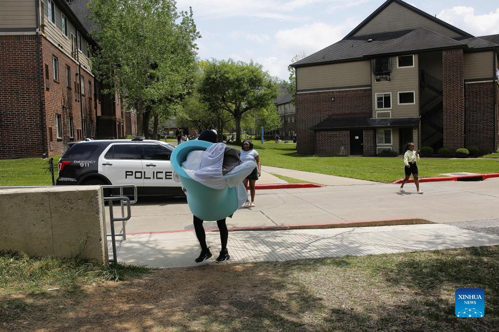 A student moves items out of a dorm building where a fire broke out at the Prairie View A&M University in Texas, the United States, on April 20, 2022. At least four people, including three students, were injured in a fire at a dorm building of the Prairie View A&M University early Wednesday morning, authorities said. (Photo by Chengyue Lao/Xinhua)