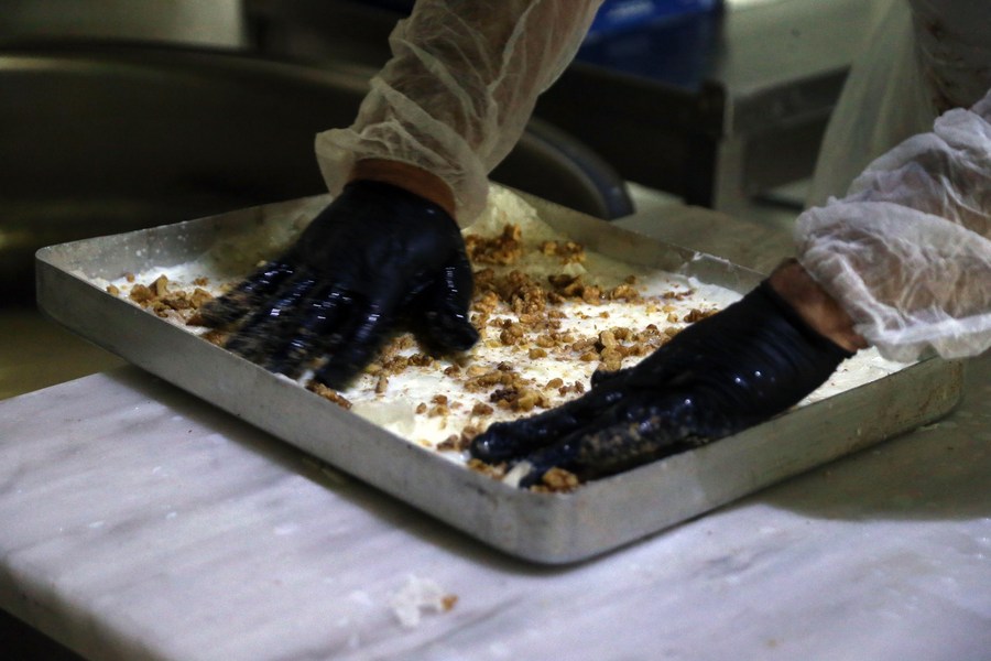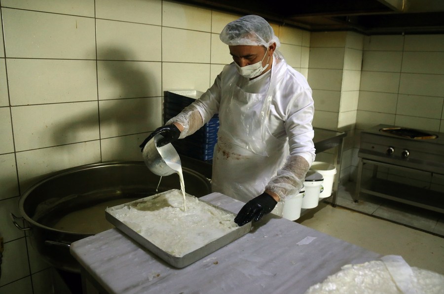 A confectioner makes the Turkish dessert Gullac at a bakery in Ankara, Turkey, on April 19, 2022. (Photo by Mustafa Kaya/Xinhua)