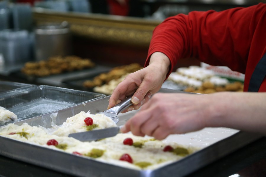 A waitress packs the Turkish dessert Gullac at a bakery in Ankara, Turkey, on April 19, 2022. (Photo by Mustafa Kaya/Xinhua)