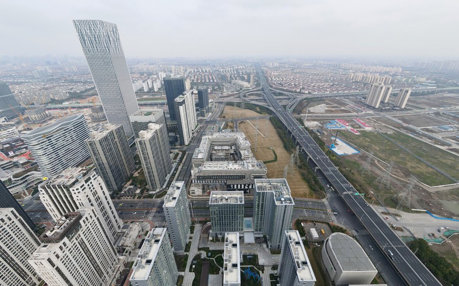 Aerial photo taken on Feb. 16, 2022 shows the construction site of the new campus of New York University (NYU) Shanghai, in east China's Shanghai. (Xinhua/Fang Zhe)