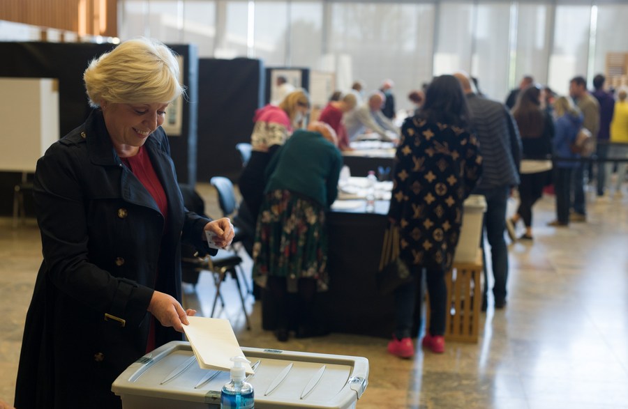 A woman casts her ballot during the early voting for the 2022 Slovenian parliamentary election at a polling station in Ljubljana, Slovenia, on April 20, 2022. (Photo by Zeljko Stevanic/Xinhua)
