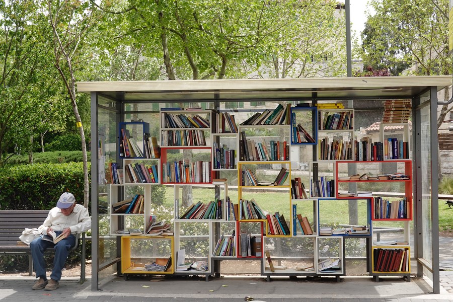 A man reads a book at a street library in Jerusalem ahead of the World Book Day, on April 22, 2022. April 23 marks the World Book Day. (Xinhua/Wang Zhuolun)