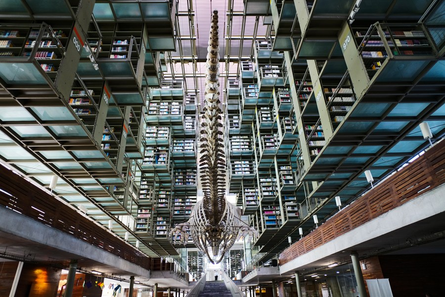 Photo taken on April 18, 2022 shows a grey whale skeleton installed in the Vasconcelos Library in Mexico City, Mexico. (Xinhua/Xin Yuewei)
