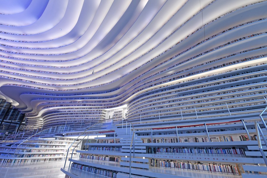 Photo taken on April 20, 2022 shows the interior view of the Tianjin Binhai Library in Tianjin, north China. (Xinhua/Zhao Zishuo)
