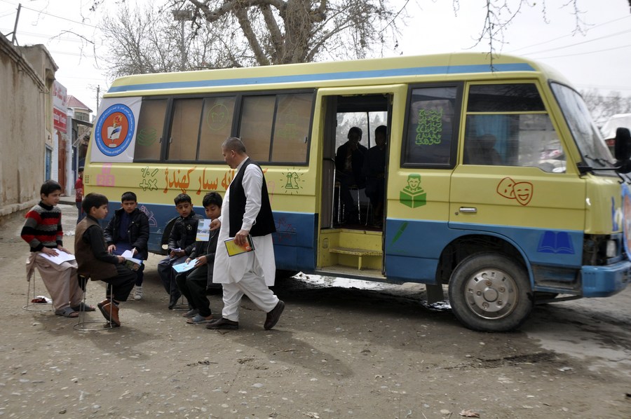 Afghan children read books beside a mobile library bus in Kunduz city, northern Afghanistan, on March 7, 2022. (Photo by Khaibar Momand/Xinhua)
