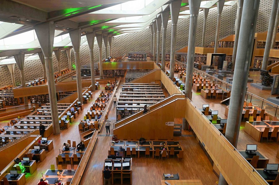 Photo shows a view of the interior of the Bibliotheca Alexandrina in Alexandria, Egypt, on April 19, 2022. (Photo by Ahmed Draz/Xinhua)