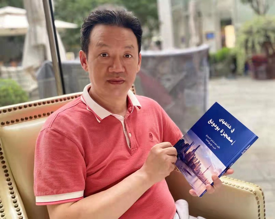 The photo shows Wang Youyong, a Chinese professor of Arabic literature at Shanghai International Studies University, holding the book of Shanghai Pudong Miracle, which was translated by him in Arabic. (Photo courtesy of the books' translator Wang Youyong)