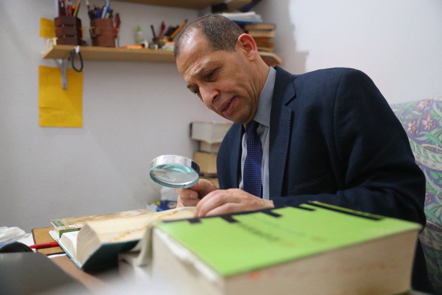 Mohsen Fergani, a professor of Chinese literature at the Ain Shams University in Egypt, reads books at his home in Cairo, Egypt on April 18, 2022. (Xinhua/Sui Xiankai)