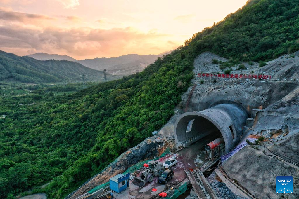 Aerial photo shows an exit of Futoushi Tunnel of Guangzhou-Shanwei Railway in Huidong County of Huizhou, south China's Guangdong Province, April 22, 2022. The Futoushi tunnel of Guangzhou-Shanwei Railway was drilled through on Friday. The 206.2km-long Guangzhou-Shanwei Railway with a maximum speed of 350 km per hour is expected to be put into operation in 2023. (Xinhua/Liu Dawei)